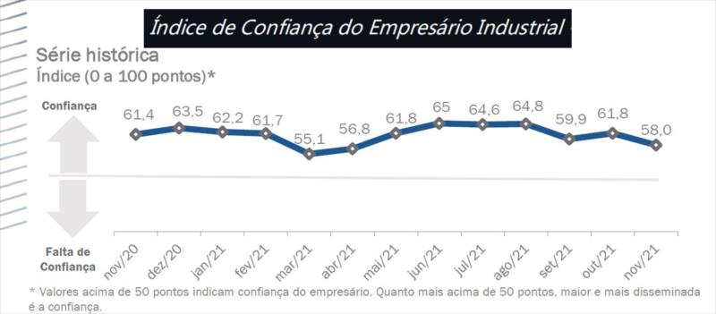 Apesar dos sinais de que a economia deve melhorar nos próximos meses com o avanço da vacinação contra a Covid 19, o Índice de Confiança do Empresário Industrial (ICEI), divulgado mensalmente pela Federação das Indústrias do Estado do Tocantins (FIETO), registrou 58,0 pontos em novembro e ficou 3,8 pontos abaixo do resultado apurado em outubro.