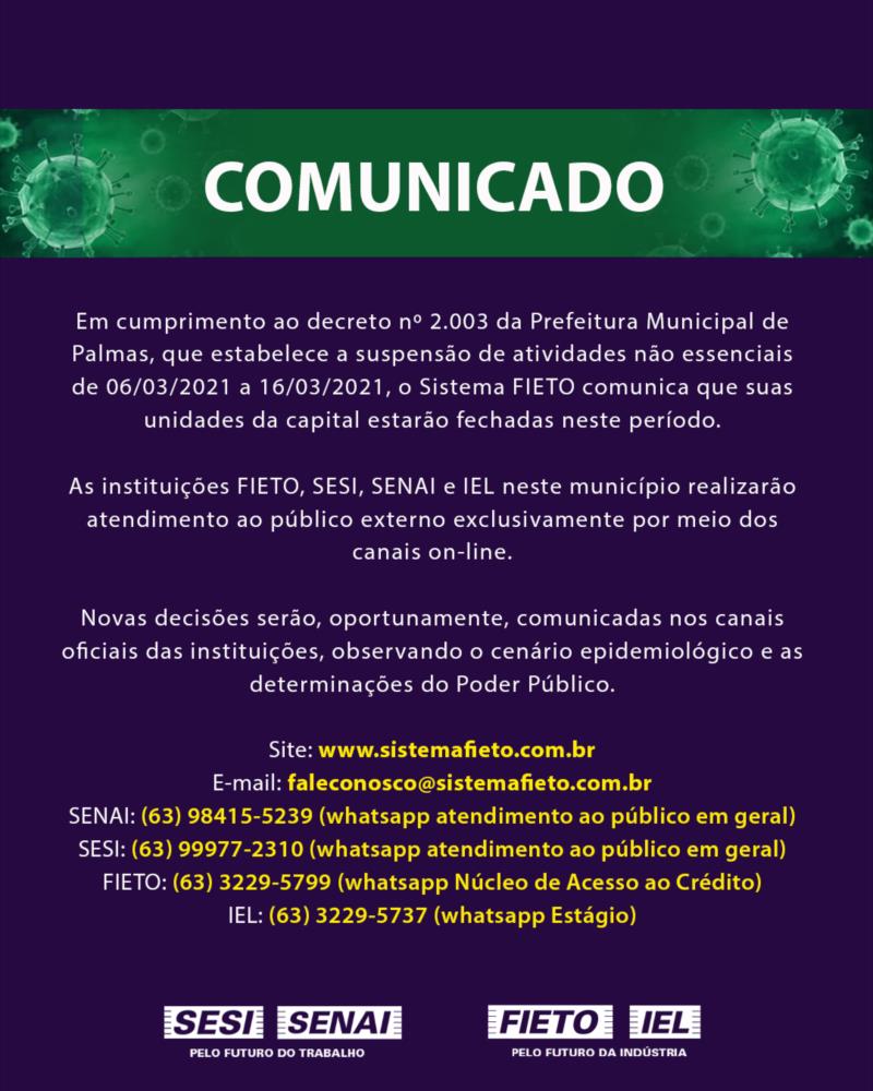 Em cumprimento ao decreto nº 2.003 da Prefeitura Municipal de Palmas, que estabelece a suspensão de atividades não essenciais de 06/03/2021 a 16/03/2021, o Sistema FIETO comunica que suas unidades da capital estarão fechadas neste período.
