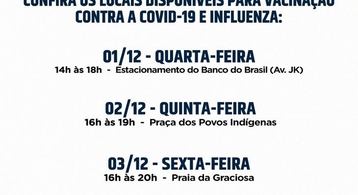 A imunização contra a Covid-19 e Influenza na Capital ganha a partir dessa semana o reforço de um ônibus. Por meio de uma parceria com o Serviço Social da Indústria (Sesi), a Prefeitura de Palmas disponibilizará a partir de quarta-feira, 1º, das 14 às 18 horas, no estacionamento da Avenida JK, em frente ao Banco do Brasil, o Busão do Mais Saúde. A aplicação das doses das vacinas continuará na quinta-feira, 02, no Parque dos Povos Indígenas, das 16 às 19 horas; e na sexta-feira, das 16 às 20 horas, na Praia da Graciosa.