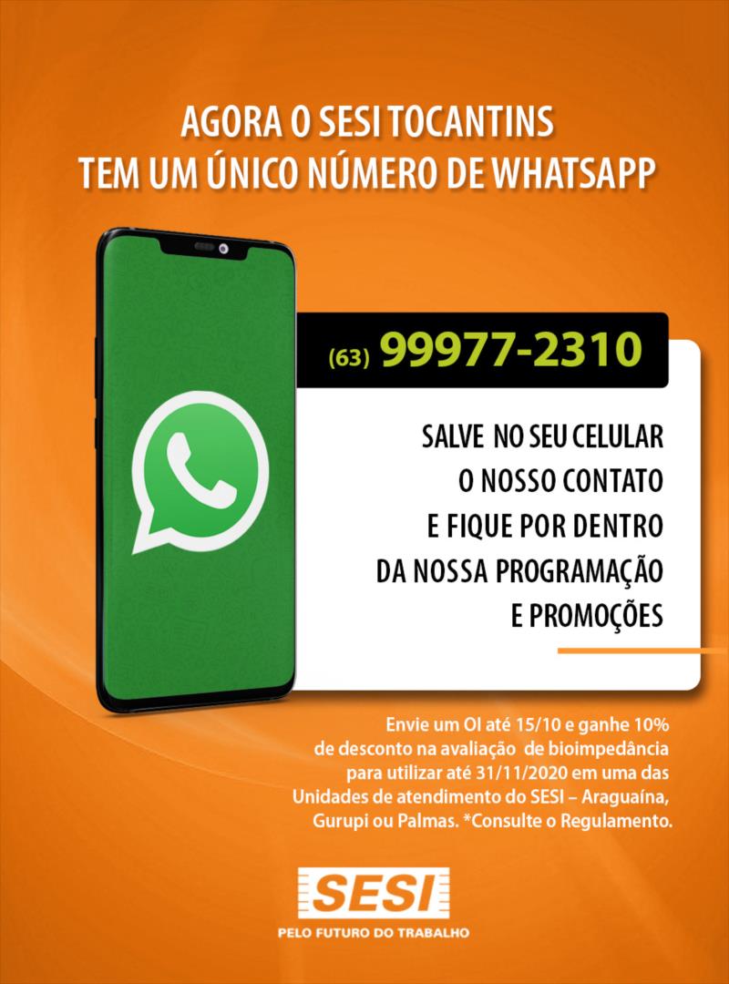 Quem interagir com o número até o dia 15/10 tem direito a 10% de desconto na avaliação de bioimpedância nas unidades do SESI de Palmas, Araguaína e Gurupi. O prazo para utilizar o desconto promocional do lançamento do Whatsapp do SESI é até 30/11/2020. Os interessados em participar devem consultar o regulamento e fazer o agendamento.