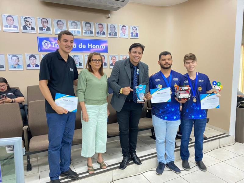 Os alunos da Escola SESI de Araguaína, Regimar Negreiros e Sérgio Gabriel, o professor Ulisses Queiroz e a diretora Carmelita Cavalcante participaram da sessão ordinária desta quarta-feira, 26/10, da Câmara Municipal de Araguaína na qual foram entregues os certificados com a Moção de Aplausos por terem representado a cidade e o Tocantins na Olimpíada Brasileira de Robótica (OBR) sendo os campeões do nível 2, modalidade prática. Encerrada no último final de semana, a competição nacional testou o robô autônomo desenvolvido pelos alunos da equipe denominada SESI Tucuna para percorrer um ambiente de desastre hostil com a tarefa de resgatar todas as vítimas sem interferência humana nas provas em mesas que simularam esta situação.Com o primeiro lugar alcançado na OBR, os alunos vão representar o Brasil na RoboCup, maior evento de robótica do mundo, que ocorre em julho de 2023, na França.