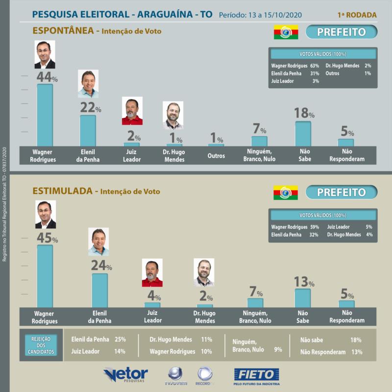 Foi publicada no site www.fieto.com.br a pesquisa de intenção de votos nas eleições de 2020 para o cargo de prefeito em Araguaína/TO encomendada ao Instituto VETOR pela Federação das Indústrias do Estado do Tocantins (FIETO) e TV Jovem/Record Tocantins.