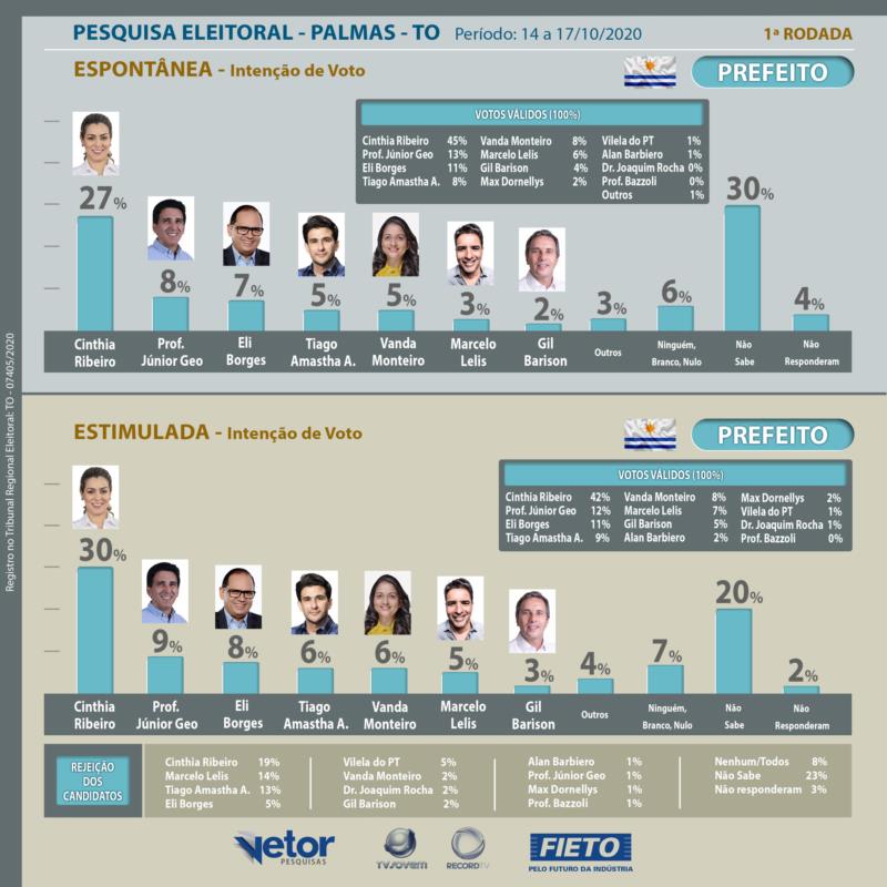 As entrevistas em Palmas foram realizadas de 14 a 17 de outubro com intervalo de confiança de 95% e margem de erro estimado em 3,5 pontos percentuais. O registro da pesquisa foi feito no Tribunal Regional Eleitoral (TO-07405/2020 - Prefeito).