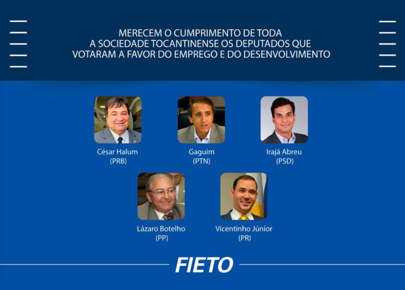 A Federação das Indústrias do Estado do Tocantins parabeniza cada um dos deputados que foram favoráveis à aprovação do Projeto de Lei nº 4.302/1998 que regulamenta a terceirização. Essa medida é de fundamental importância para a retomada do crescimento econômico, para a segurança jurídica das relações de trabalho terceirizadas, bem como para a geração de emprego e renda aos brasileiros.