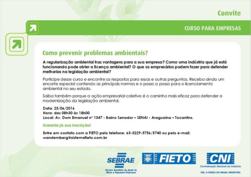 Empresários interessados em adquirir conhecimento sobre as normas e procedimentos ambientais vigentes podem participar, no próximo dia 23/06, da capacitação “Como Prevenir Problemas Ambientais?” que será realizada no Centro de Educação e Tecnologia (CETEC/SENAI) de Araguaína pela Federação das Indústrias do Estado do Tocantins (FIETO). O curso acontece de 8h30 às 18 horas e será instruído pelo engenheiro florestal Luciano Dantas Alencar. As inscrições são gratuitas, voltadas a empresários industriais e representantes das empresas e podem ser feitas via e-mail (wandemberg@sistemafieto.com.br) ou por meio do telefone (63) 3229-5756 ou 5740 até o preenchimento das vagas.